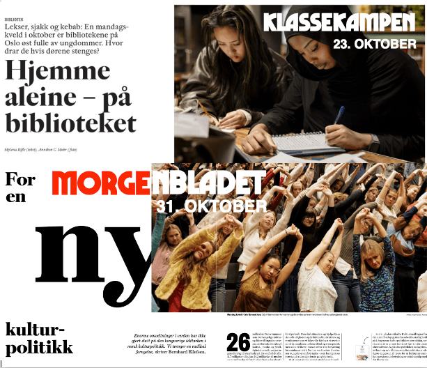 Klassekampen og Morgenbladet har nyleg vekt bloggaren i meg. Det handlar om KKs reportasje 23. oktober om Deichman som møteplass for unge, men som blir rasert når meirope blir kutta i budsjettet. Og i MB Bernhard Ellefsens kulturpolitiske «manifest» ei veke seinare.
