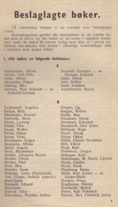 Nazistane dreiv omfattande sensur under andre verdskrigen, både av presse, kringkasting og forlag. I arkivet i kjellaren på Statens bibliotektilsyn fann underteikna for mange år sidan den 24 sider lange lista «Beslaglagte bøker», som den nazifiserte etterkomaren etter det statlege «Kontoret for folkeopplysningsarbeid» gav ut under krigen (dette nazistiske «Litteratur- og Bibliotekkontoret» var faktisk underlagt landets første «Kulturdepartement»! Før og etter krigen heitte det «Kirkedepartementet» og først i 1991 fekk landet eit eige Kulturdepartement).