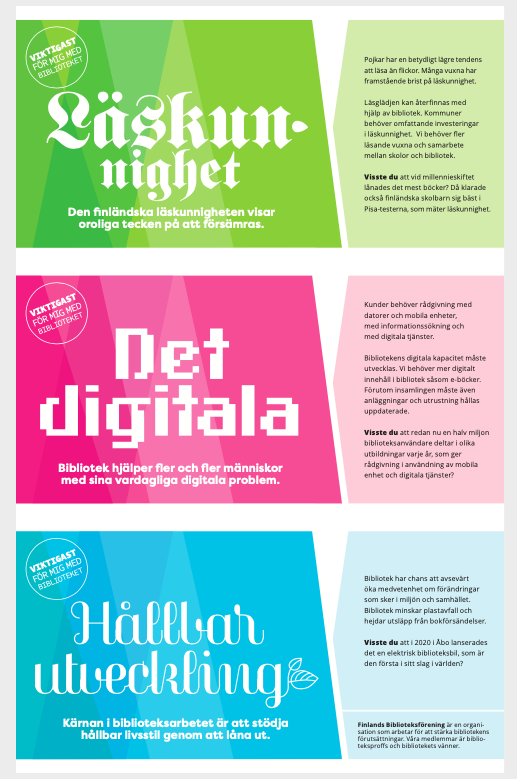 Viktigast för mig med biblioteket är en kampanj, som Finlands Biblioteksförening driver inför kommunalvalen i Finland 13 juni 2021. På kampanjens webbplats möter ögat sex teser som förklarar varför bibliotek är viktiga: