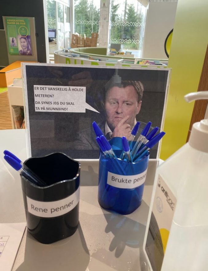 På dei biblioteka underteikna har vore på etter opninga her i det såkalla Viken, har vi berre sett enkle skilt om å halde avstand og bruke munnbind, og på eit bord ved inngangen har vi møtt ei spritflaske og ei liste ein skal skrive seg inn og ut på. Og to koppar med reine pennar i den eine og ureine i den andre. Men ingen vakt nokon stad og elles ikkje peikefingrar å sjå.