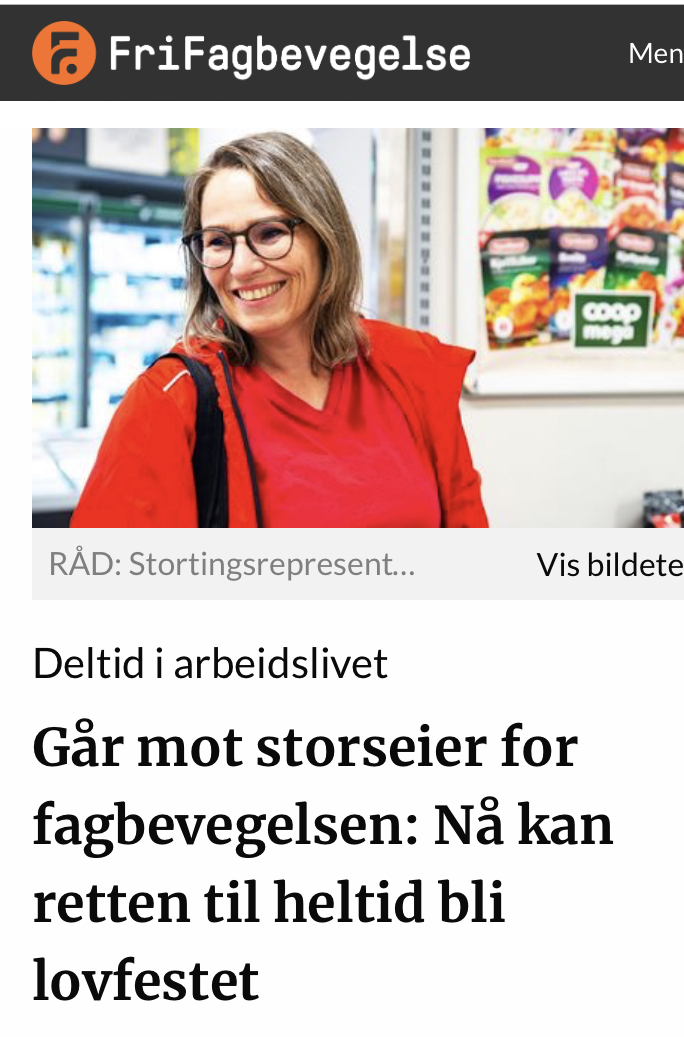 «- Går mot storseier for fagbevegelsen», heiter det i Fri Fagbevegelse: «Nå kan retten til heltid bli lovfestet. Jobber du ufrivillig deltid? Snart blir det svært vanskelig for arbeidsgiverne å spekulere i små stillingsbrøker, fastslår Trine Lise Sundnes (Ap)».