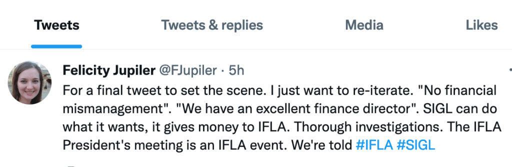 One important source of information about IFLA’s current crisis which Biblioteksbladet did not mention in its special issue is the Twitter account @FJupiler aka Felicity Jupiler. Biblioteksbladet might have got some of its data from that direction but decided not to mention about it for the reason that nobody seems to know the person behind the name.